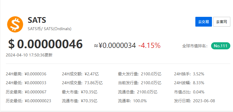 sats币价格今日行情,sats币是目前最火的代币之一,软件具有去中心化、匿名性、安全性等特点,还受到市场供需关系、投资者情绪等因素的影响。不少小伙伴还不太清楚sats币价格最新消息是什么,接下来给大家带来了sats币价格今日行情说明!