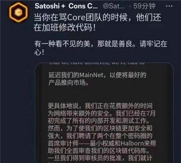 上方图中公告表示目前core主网进度已经到代码审核中,将会很快和大家见面了,未上线是因为审计工作结束,工作人员还没有把它上在主网上,。根据查询相关信息得知,core币上主网的流程需要工作人员进行操作,流程繁琐。