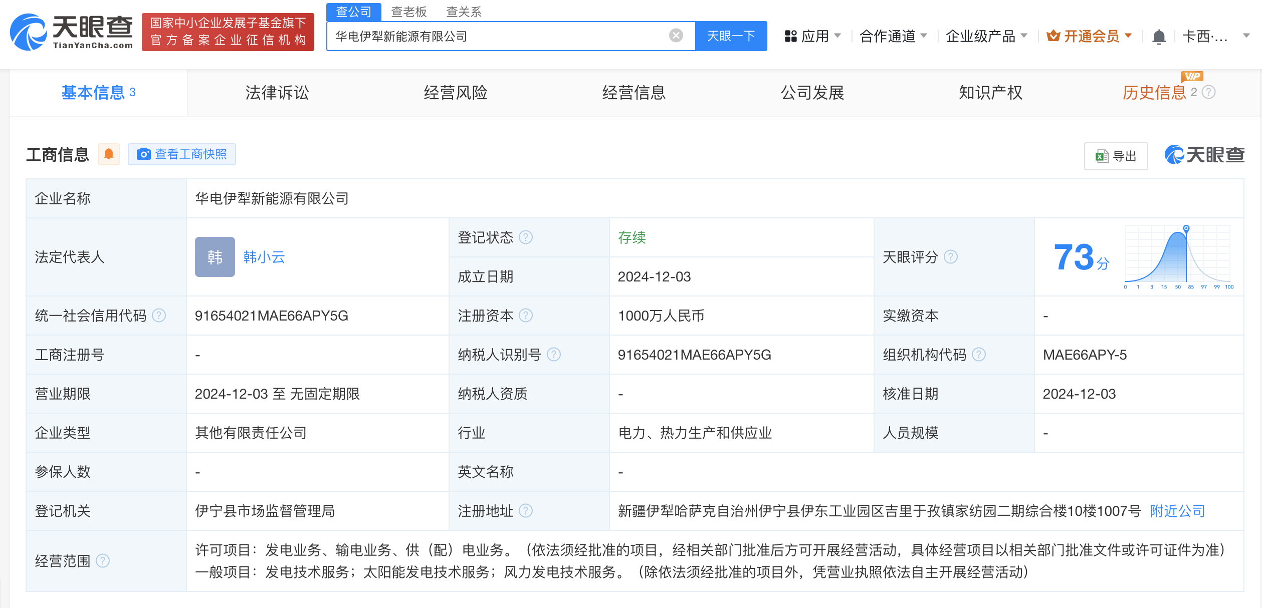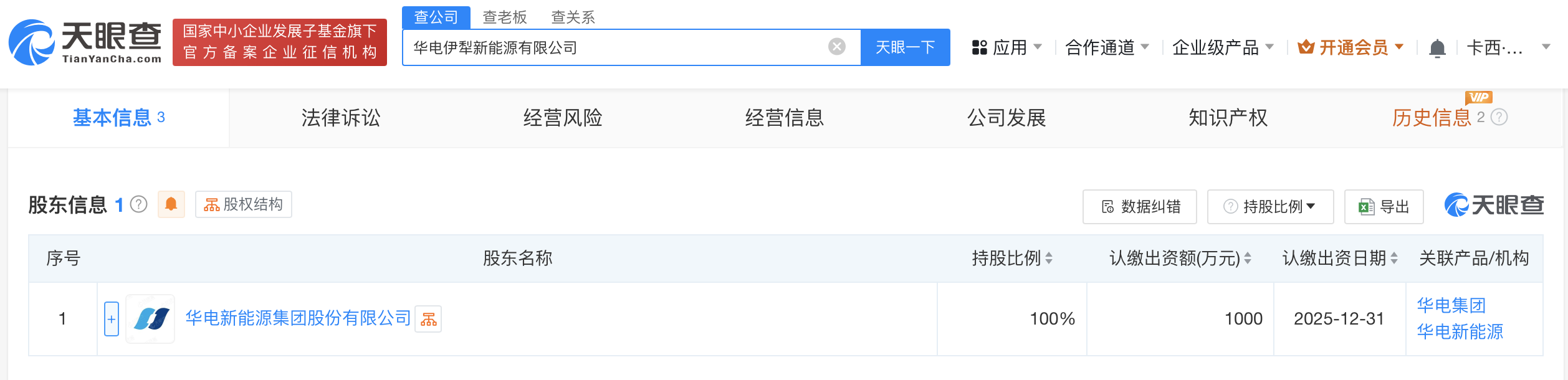 天眼查App显示,近日,华电伊犁新能源有限公司成立,法定代表人为韩小云,注册资本1000万人民币,经营范围含发电技术服务、太阳能发电技术服务、风力发电技术服务等。股东信息显示,该公司由华电新能源集团股份有限公司全资持股。