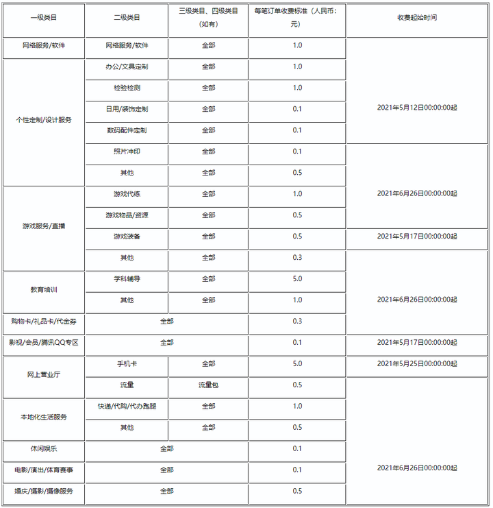 2.2.1.部分虚拟商品的类目技术服务费收费范围及收费标准如下: